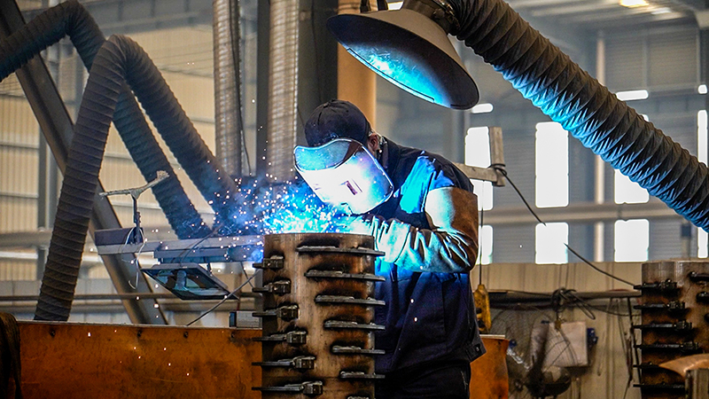 焊接區(qū)內(nèi),焊工正在專注作業(yè),藍色的焊接弧光此起彼伏,老師傅們手法嫻熟,每條焊縫都均勻美觀。