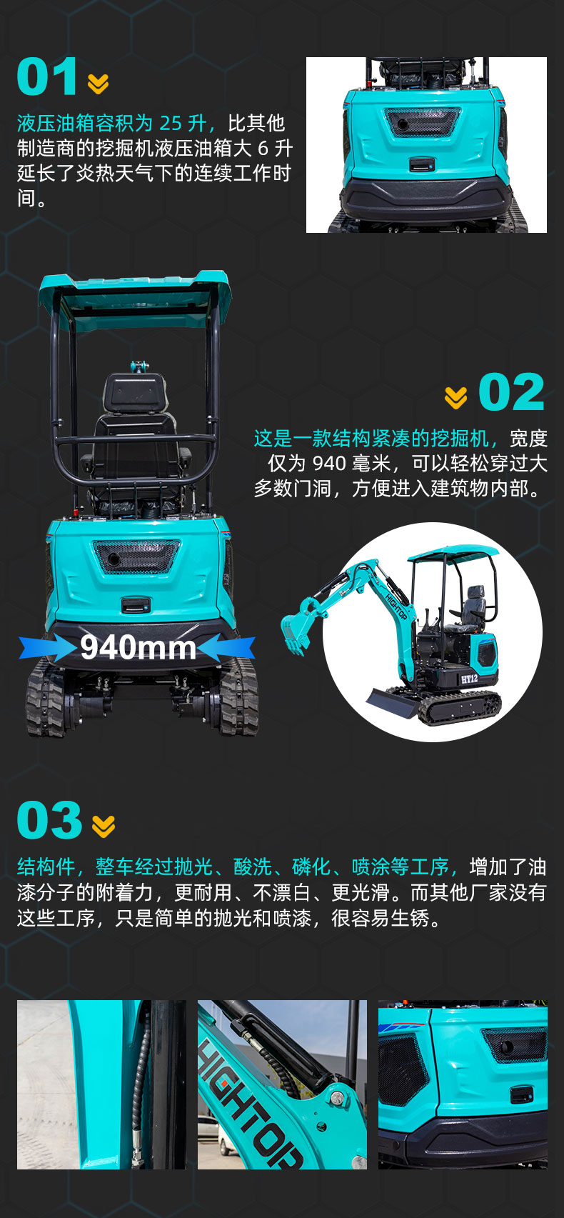 HT12 1200kg 小型挖掘機(jī)液壓油箱容積為 25L,比其他制造商的挖掘機(jī)液壓油箱大 6 升,延長了炎熱天氣下的連續(xù)工作時(shí)間。
